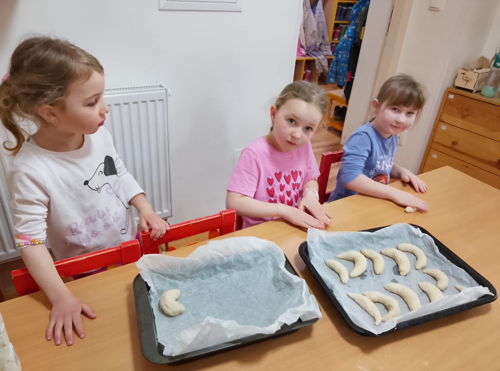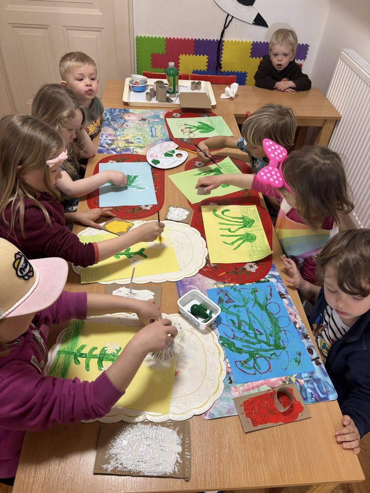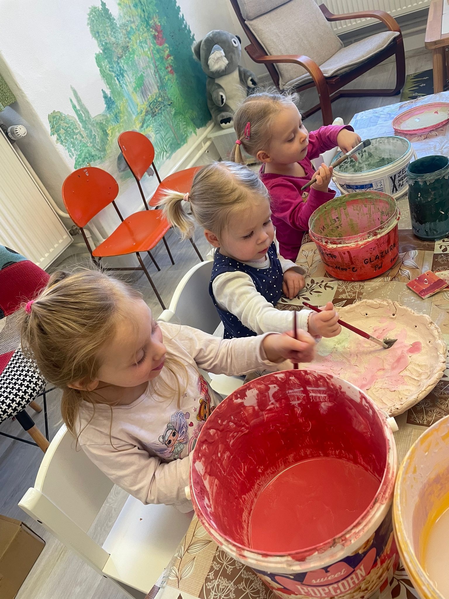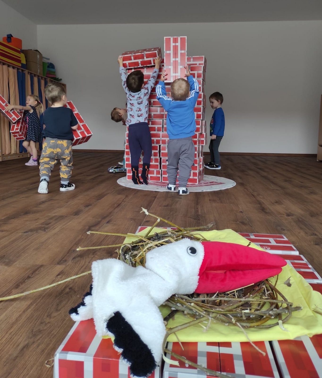I když jsme teprve na začátku, nuda u nás rozhodně nemá místo. Celou hernou se často rozléhá veselý zpěv doprovázený hrou na piano a malí stavitelé naplno využívají barevné kostky. Naši nástěnku už dokonce zdobí úplně první společný výtvor, na který jsme patřičně hrdí.