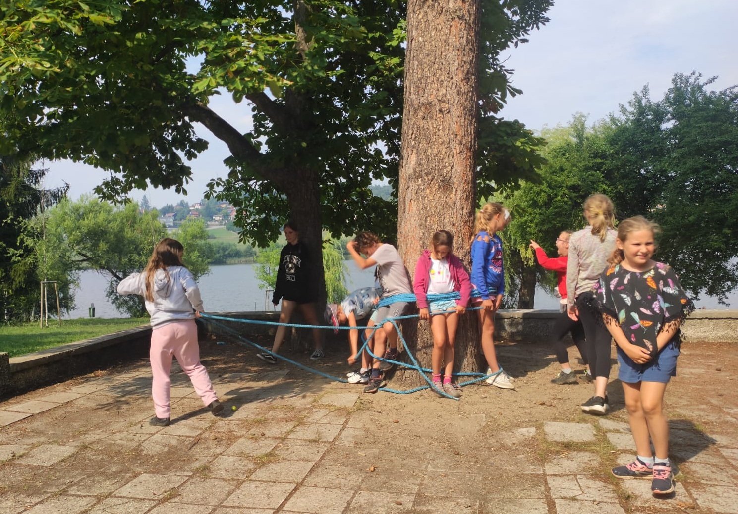 Třetí táborový týden jsme strávili v pohybu. A ne tak ledajakém, závodili jsme o sto šest. Nejprve jsme se rozdělili na tři týmy, každý tým si vybral jakou zemi bude reprezentovat, vyrobil si svou vlastní vlajku a vymyslel pokřik. Zahájili jsme hry první disciplínou – přetahování lanem, byla to fuška. 🙂