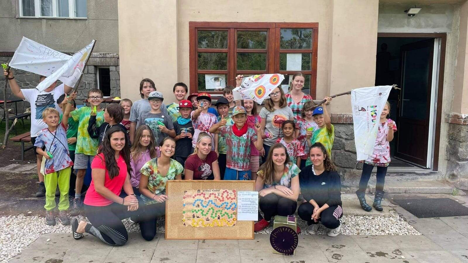 První den nás Stroj času přenesl do budoucnosti k mimozemšťanům. Po splnění mimozemské šifrované, nabatikování týmových triček a namalování vlajky jsme získali své první odznaky. Byli jsme rozděleni do 4 týmů, o poklad usilovali Vlkodlaci, Strážci času, Draci a Hodináři. Během celého týdne bylo potřeba získat 5 odznaků z 5 různých dob a 10 kusů mapy.