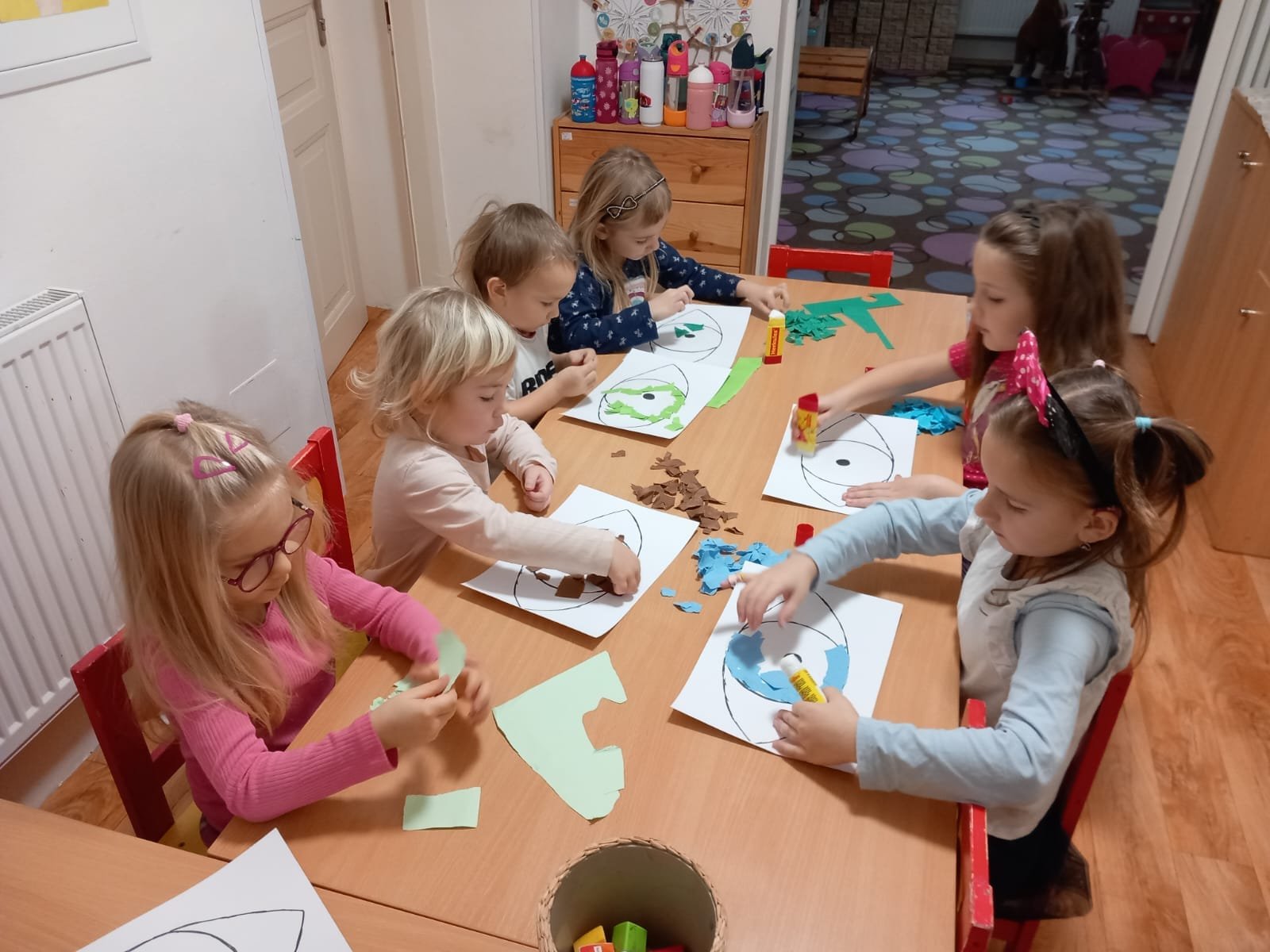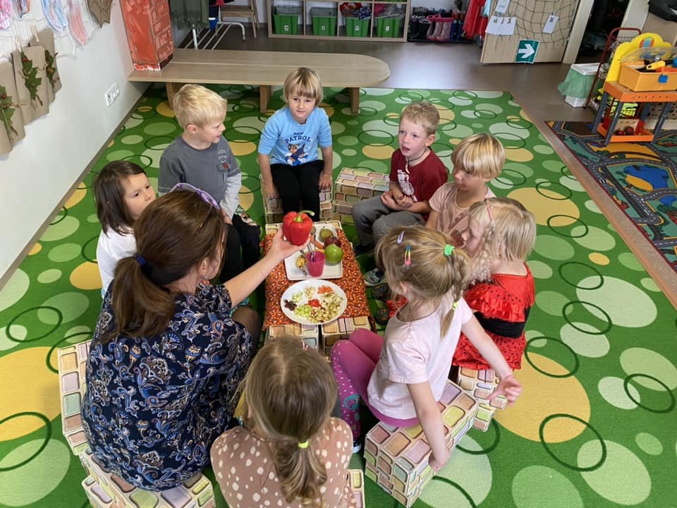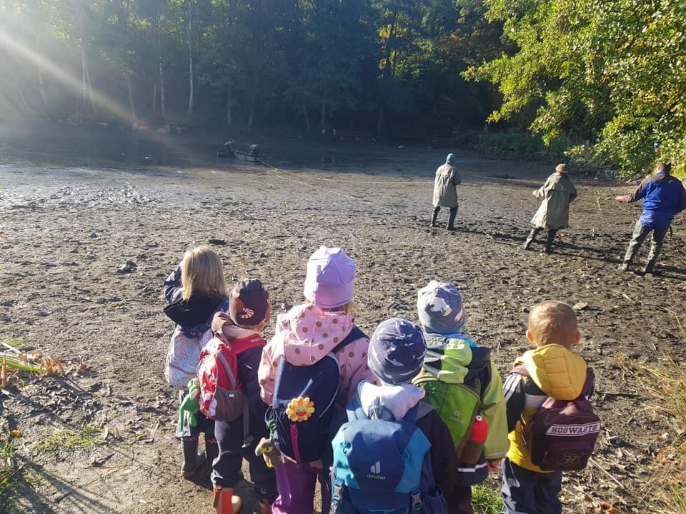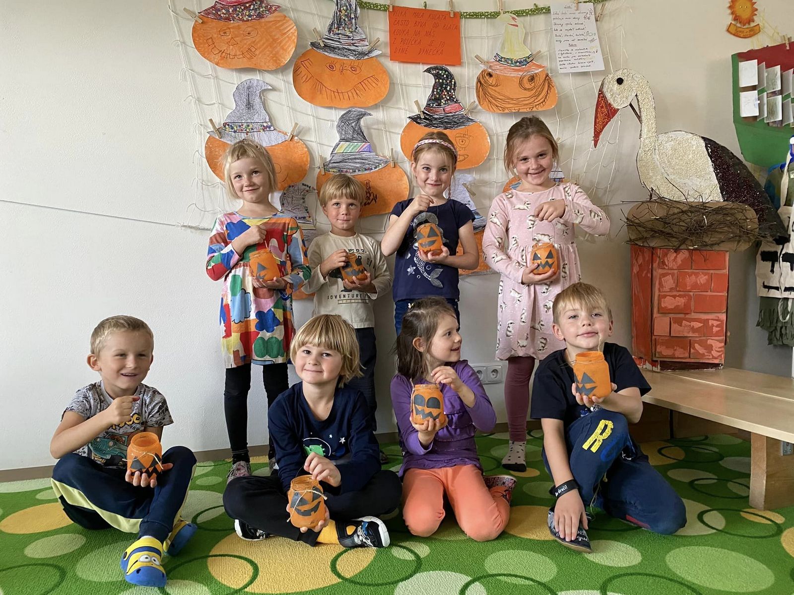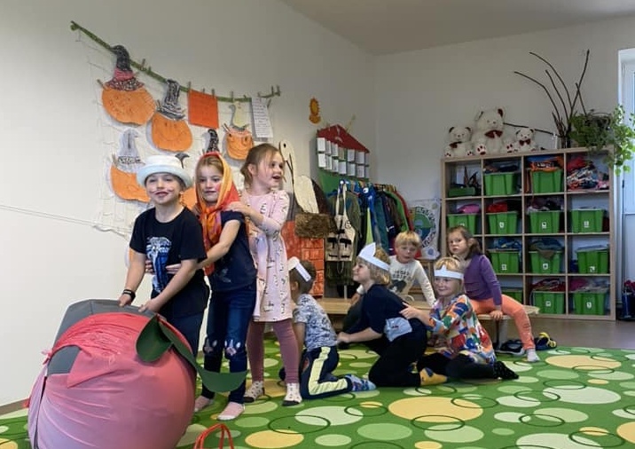 Protože nám počasí přálo, chodili jsme v říjnu hodně ven a pozorovali jsme podzimní přírodu, dokonce i výlov rybníka, pracovali jsme na zahrádce, sklízeli jsme jablíčka, hřáli se u ohně, vařili jsme, ochutnávali, slavili, starali se o zvířátka a přichystali jsme domeček pro ježky. Chodili jsme na procházky a pouštěli draky. Zelená Čápátka navštívili skřítci Kaštánek, Dubínek, Šípek a víla Jabloňka a děti si vytvořily vlastního skřítka Podzimníčka. Také si zahrály pohádku O veliké řepě a O budce. Podzim nám přináší spoustu příležitostí k barevnému tvoření a toho jsme náležitě využili.
