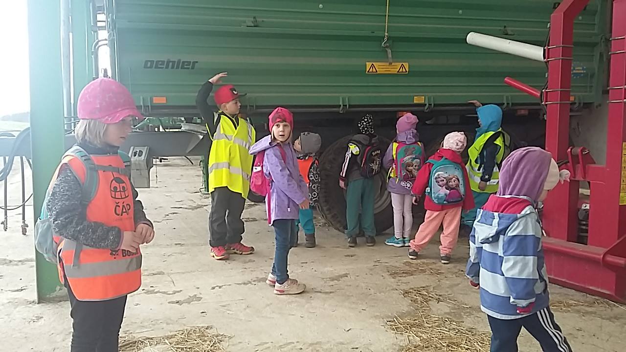 Cesta to byla velmi zajímavá a veselá. Nejprve jsme jeli autobusem do Buše a odtud šli pěšky po louce do Nových Dvorů, kde na nás u ocelokolny čekal Petr a ukázal nám jeho stroje. Mohli jsme si i vylézt do traktoru, přepočítali jsme valníky a pobavili jsme se při skládání se do kol traktoru. 🙂 Pak nás čekala cesta do kravína, tady jsme si prohlédli kravičky i s telátky a býky a další zvířátka, mimo jiné i psa Charlliho. Na závěr jsme se vydali k tetě Hanče a odpočinuli si. Počasí nám přálo, a tak jsme poobědvali venku. Po krátkém odpočinku nás Anežka a Mareček provedli po jejich hřišti.